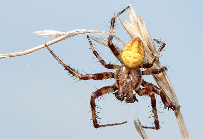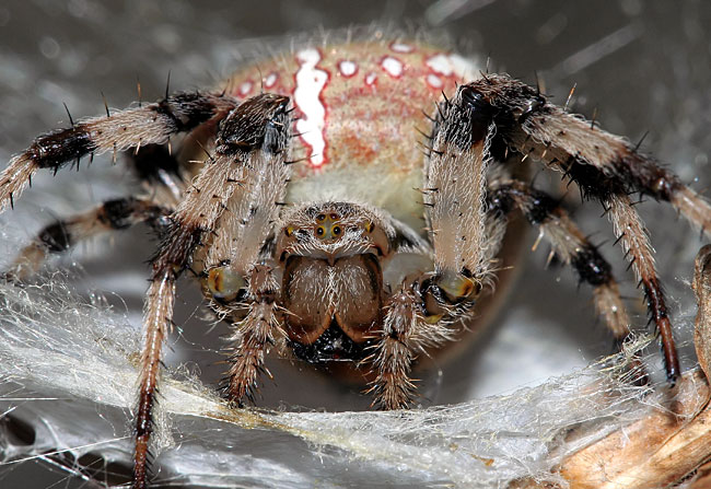 abdomen mu je sjajno braon sa belim znakovima. Ovaj pauk se uglavnom