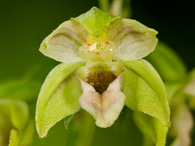 Ginostemijum žućkastozelen. Antera široka, skoro trouglasta, žućkasta.