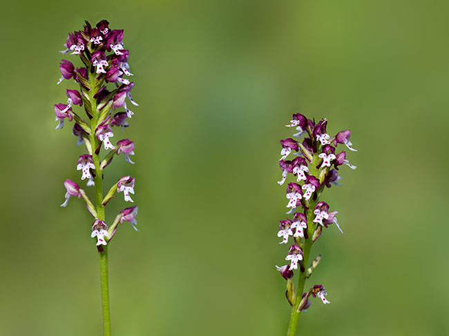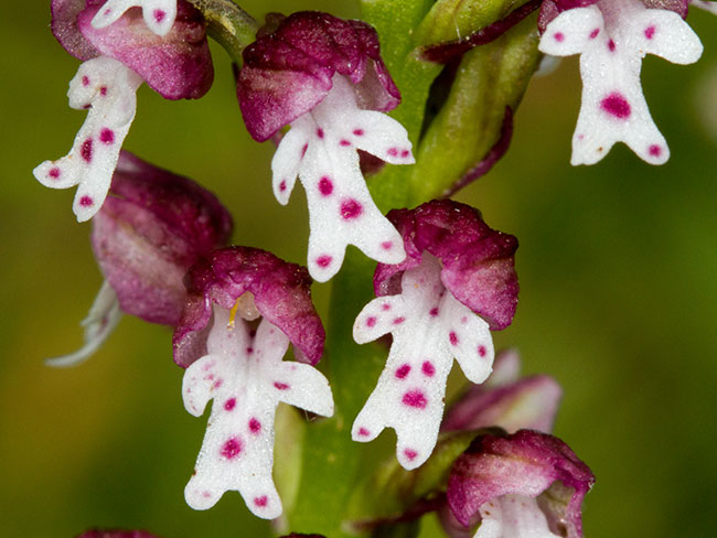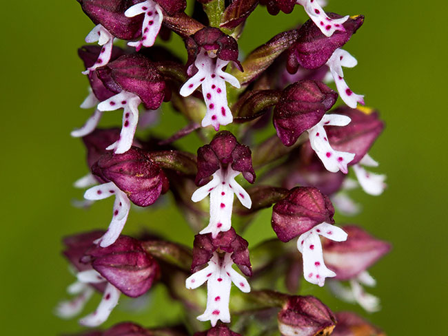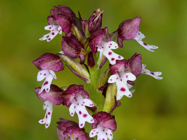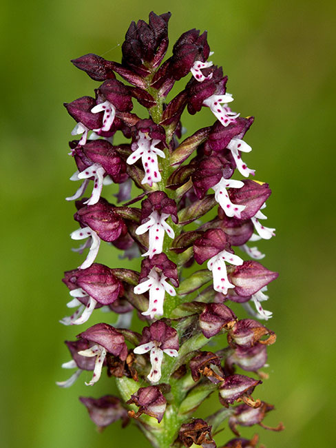 Višegodišnja biljka. Gomolji loptasti do jajasti, pored ovihrazvijeni su i srazmerno debeli korenovi. Stabljika tanka, visoka 10-30 (50) cm, na poprečnom preseku ± okrugla do neznatno uglasta, svetlo zelene boje. Listovi izduženo lancetasti do skoro linearni, pri osnovi prošireni u obliku rukavca, na vrhu šiljati, plavičastozeleni, na donjem delu stabljike međusobno zbijeni, veliki, gornji su manji, priljubljeni uz stablo koje obuhvataju u vidu rukavca. Cvast klasolika, pre cvetanja kupasta do jajasta, crnkastopurpurne boje, kasnije valjkasta, pri osnovi nešto rastresitija, sastavljena od brojnih cvetova. Cvetovi mali, prijatnog mirisa (na med ili vanilu, ređe neprijatnog na stenice). Donje brakteje malo ili za polovinu kraće od plodnika, jajasto lancetaste, šiljate, većinom sa jednim nervom, gornje iste dužine ili duže od plodnika, obično svetlo ljubičaste do purpurne. Listići perigona slobodni, skupljeni u vidu kratke, skoro loptaste, zatupaste kacige, spolja tamno purpurnomrke, iznutra mnogo svetlije, ljubičastozelenkaste boje. Bočni spoljašnji listići su jajasti, većinom širi od srednjeg i nešto šiljatiji. Bočni unutrašnji su kraći i mnogo uži. Labelum duboko trorežnjevit, naniže upravljen, nešto duži od spoljašnjih listića perigona, dugačak 2-4 mm, beo ili ređe svetlo crven, poprskan malobrojnim, većinom tamno purpurnim pegama; bočni režnjevi izduženi i odsečeni, često na krajevima prošireni i katkad nazubljeni, srednji režanj duži i ka vrhu postepeno proširen, na vrhu rasečen u 2 kratka, zatupasta, često nazubljena režnjića, među kojima se često nađe i jedan zubac. Ostruga kupasta, dugačka 1-1,5 mm, zatupasta, dugačka kao 1/3 do 1/4 plodnika, naniže savijena, bele do ljubičaste boje. Srazmerno veliki ginostemijum nosi žućkastu anteru.