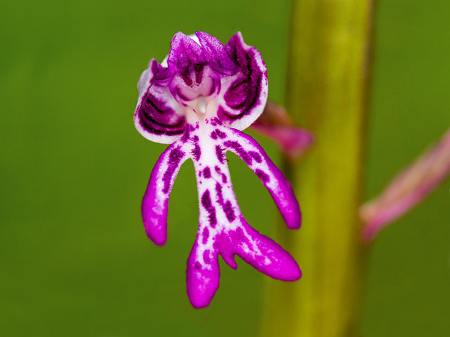Antera tamno ljubičasta. Polinije plavosive. Cveta u maju mesecu.