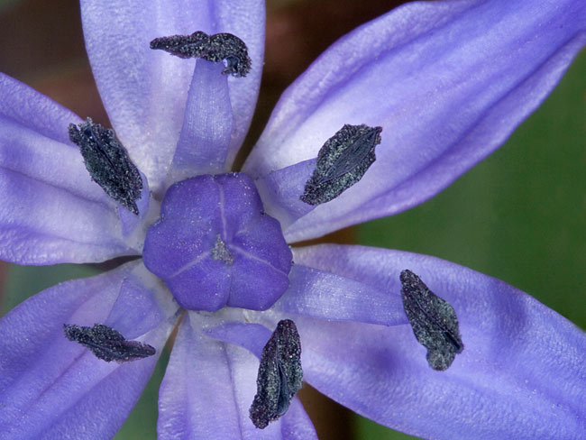 pljosnati, plavi, antere ljubičaste, kasnije skoro crne. Plodnik