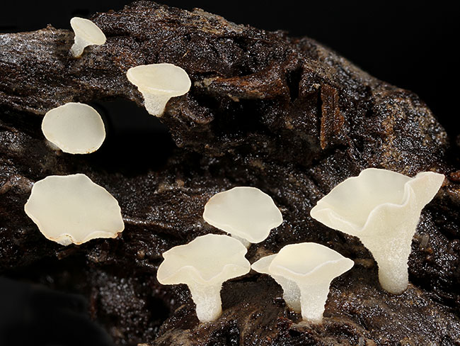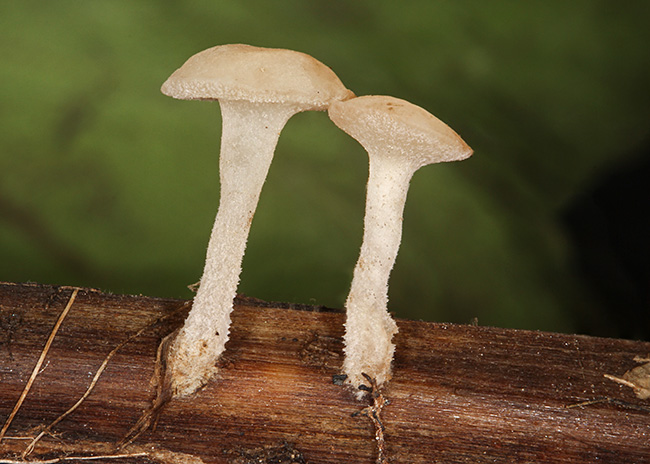 Opis: Raste krajem leta i u jesen, pojedinačno ili u grupi na grančicama i listovima listopadnog drveća i grmlja, kao i na trulim zeljastim stabljikama, uvek na jako vlažnim mestima. Askomata 3-12mm u prečniku, u početku čigrasta a kasnije jastučasta sa izraženom drškom (do 20 mm). Himenijum vlažan, gladak, sivo-beličast do oker-beličast, ponekad sa blago ljubičastom nijansom. Spoljašna strana iste boje ili malo svetlija od himenijuma. Drška kratka, zdepasta, bočna (ponekad rudimentirana ili odsutna), 5-20 x 0,7-1,5 mm, jednake širine ili tanja ka vrhu ili osnovi; glatka, beličasta, ka vrhu braon a prema osnovi braonkasto-crna. Mikroskopske karakteristike: Askusi sa 8 spora, (90-) 100-115 x 9-10 µm, cilindrični, variraju u dužini, J+(p), kr.+. Parafize končaste, sa pregradama, ponekad granate, ispunjene refraktivnim vakuolama. Spore elipsoidno-vretenaste, često uže na jednom kraju, glatke, hijaline, (8-) 9,5-15 x (3,5-) 4-5 µm, bez uljanih kapi. Rasprostranjenost: Evropa, Severna Amerika i Australija (GBIF). Ref.: Breitenbach, J. & Kraenzlin, F. (1984) Champignons de Suisse, tome 1.