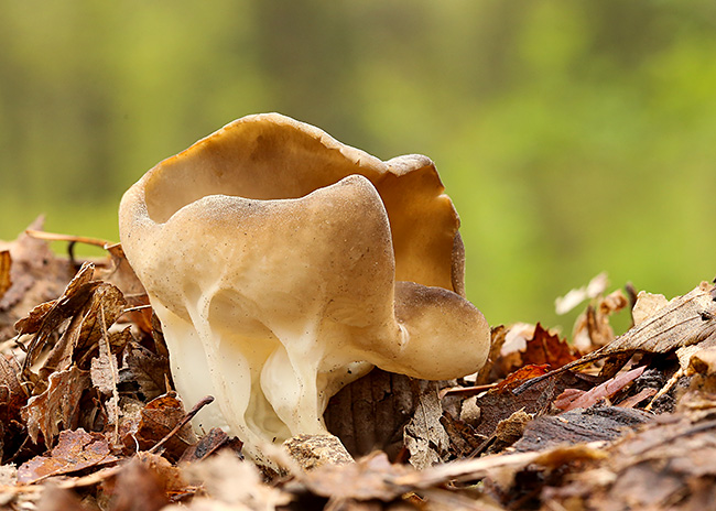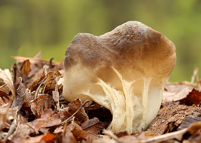 Opis: Verovatno mikorizalna, raste pojedinačno ili u grupi na zemlji u listopadnim i četinarskim šumama, po pašnjacima, pored puteva, od proleća do ranog leta. Apotecije prečnika 2-6 (12) cm, visine 2-7 (10) cm, školjkaste do peharaste, nepravilno talasaste, vremenom postaju raširene. Himenijum gladak, sivo-braon, kestenjast ili crveno-braon. Spoljašnja strana iste boje kao himenijum, postaje bleđa prema dršci, fino dlakava. Drška glatka do fino dlakava, dužine 2-9 cm i širine do 5cm, sa belim do oker, anastomoziranim uzdužnim rebrima koji se nastavljaju na pehar, često do same ivice.