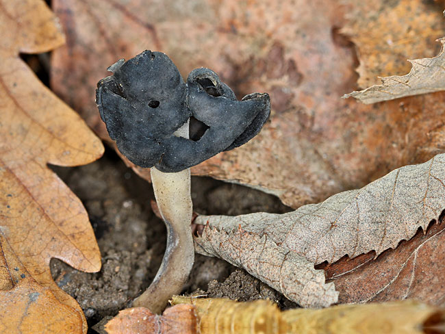 Opis: Saprofit (moguće i mikorizalna), raste u leto i jesen, pojedinačno ili u grupi na zemlji uglavnom u četinarskim šumama, po peskovitim zemljištima, ponekad i po baštama. Plodna tela visine do 10 cm, kapica prečnika 1-3 cm, sedlasta do skoro tanjirasta, često deljena u 2-3 režnja. Himenijum gladak ili malo naboran, tamno smeđe-siv do crn, ivica nepravilno savijena na gore. Spoljašnja strana glatka do fino dlakava, siva do braon-crna, svetlija od himenijuma. Drška glatka do fino dlakava (posebno prema vrhu), prečnika do 1cm, često sa uzdužnim žljebovima, vijugava, blago sužena prema osnovi, čvrsta, sivkasto-oker do braonkasto-crna.