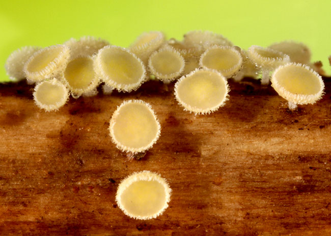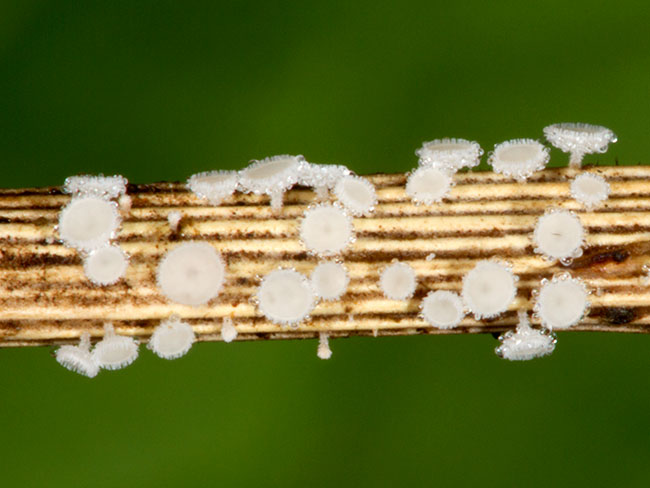 Opis: Saprob, raste pojedinačno ili u grupi od or proleća do leta na trulim stabljikama trava (Poaceae). Apotecije prečnika 0,6-1 mm, dok su mlade plitko peharaste a zatim tanjiraste i blago ispupčene. Himenijum beličast do žućkasto-krem, gladak; ivica belo dlakava. Spoljašnja strana iste boje kao himenijum, gusto pokrivena belim dlakama. Drška cilindrična, duga 0,3-0,5 mm, pri osnovi bela.