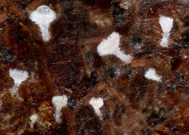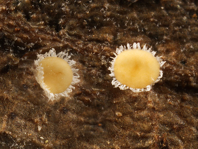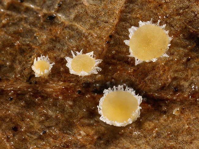 Opis: Saprob, raste pojedinačno ili u grupama, u proleće uglavnom na otpalim listovima hrastova (Quercus spp.) i javora (Acer pseudoplatanus), a ređe na drugim vrstama listopadnog drveća. Apotecije prečnika 0,2-0,4 mm, dok su mlade peharaste a zatim raširene. Himenijum beo, krem do žut, gladak. Spoljašnja strana i ivica gusto pokriveni istaknutim belim dlakama. Drška jasno izražena, prekrivena dlakama. Mikroskopske karakteristike: Askusi sa 8 spora, biserijatni, 35-40 x 3,5-4 μm J+, krozijer+. Parafize kopljaste, sa pregradama, nadvisuju askuse do 20 μm, širine 4,5-5 μm. Spore vretenasto-glavičaste, glatke, bez pregrada, ponekad sa nejasnim uljanim kapima, hijaline, (5) 6-9 x 1,5-1,7 μm. Dlake cilindrične, 40-60 x 2-3 (5) μm (pri osnovi sa proširenim ćelijama), hijaline, tankih zidova, sa pregradama, zaobljenih krajeva, na vrhu sa krupnim kristalima. Rasprostranjenost: Evropa, Azija, Severna Amerika.