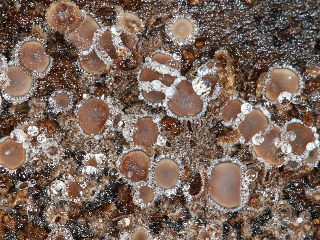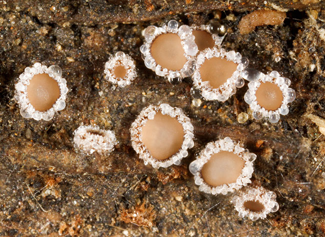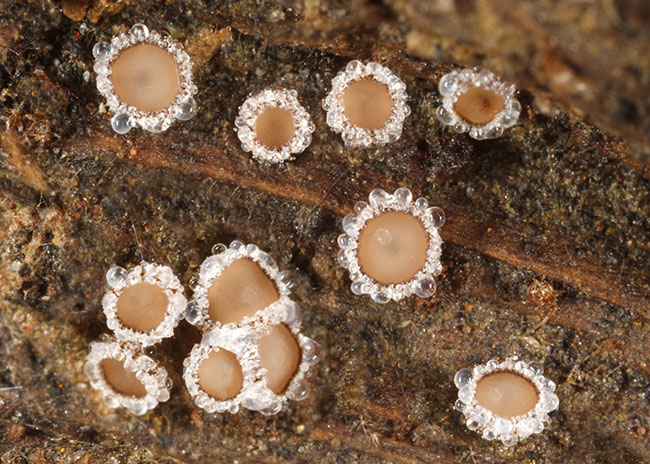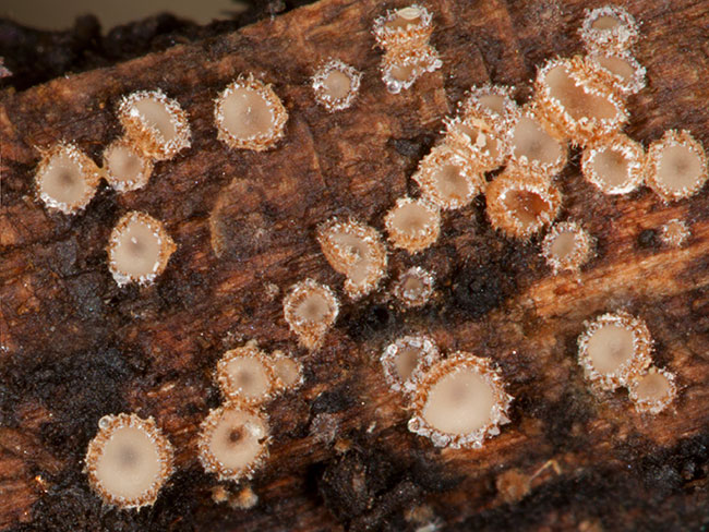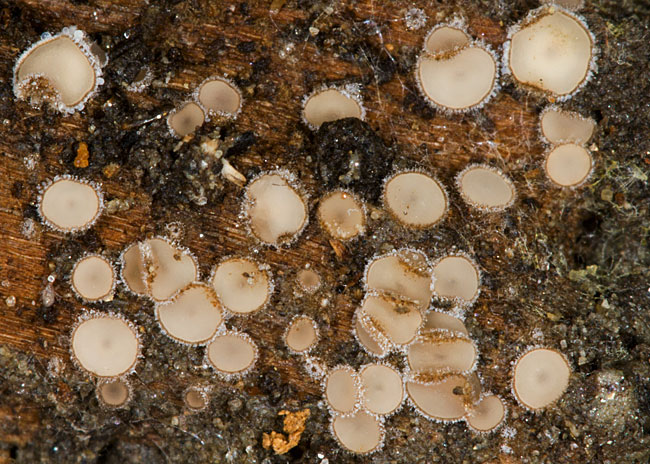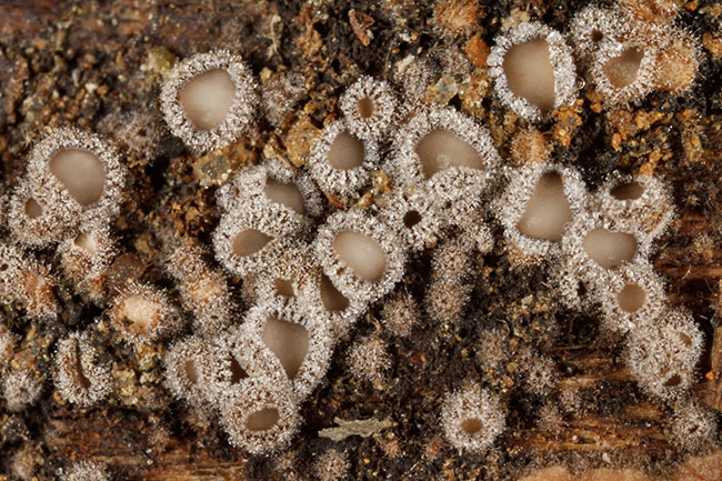 Opis: Raste u grupama na trulom drvetu (retko na papratima). Apotecije subsedeće ili sa kratkom drškom, prečnika 0,5-1 mm, peharaste. Himenijum beličast do svetlo braon, svetliji ka centru. Ivica i spoljašnja strana gusto pokriveni svetlo braon dlakama. Mikroskopske karakteristike: Dlake na ivici cilindrične, prave, zaobljene na krajevima, sa puno pregrada, umereno debelih zidova, hijaline pri bazi i na vrhu, a umereno braon u sredini, na vrhu sa masom amorfnih granularnih kristala, dužine 80-120 µm; dlake po obodu apotecije izrazito kovrdžave. Askusi sa 8 spora, biserijatni, cilindrično-glavičasti, 65-75 × 4-6 (-7) µm, J+(p), kr.+. Parafize cilindrične, zašiljene do usko lancetaste, ponekad sa pregradom pri osnovi, 48-77 × 2-4 µm, nadvisuju askuse do 12,5 µm. Spore cilindrično-vretenaste, hijaline, glatke, sužene na krajevima, blago nejednakostrane, zrele sa jednom pregradom, bez ili sa sitnim uljanim kapima na krajevima, 9,5-14,5 × 2,2-2,5 (-3,5) µm. Rasprostranjenost: Evropa, Severna Amerika i Novi Zeland (GBIF), Azija (Raitviir, 1980). Ref.: Raitviir, A. (1980) The genus Lasiobelonium.