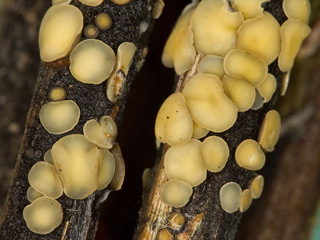 Opis: Raste pojedinačno ili u grupi na trulim stabljikama trske (Phragmites australis). Apotecije sedeće ili sa veoma kratkom drškom, prečnika 0,5-3 (-6) mm, u početku okruglaste i zatvorene, kasnije peharaste i na kraju postaju skoro ravne i često nepravilnog oblika. Ispod njih je crno-braon površina sastavljena od izukrštanih hifa prečnika 4-5 µm. Himenijum gladak, svetlo žut do oker-žut. Spoljašnja površina braonkasta. Mikroskopske karakteristike: Ekscipulum sa masom kristala. Askusi cilindrično-glavičasti, na vrhu blago zašiljeni, sa 8 spora, 80-100 x 5-6 µm, J+(p), kr.-. Parafize končaste, širine 2 µm, na vrhu ponekad blago proširene i zadebljale. Spore vretenaste, često zakrivljene, 15-24 (-29) x 2-3 µm, bez pregrada ili sa jednom pregradom (retko sa dve), sa puno uljanih kapi. Rasprostranjenost: Evropa (GBIF). Ref.: Breitenbach, J. & Kraenzlin, F. (1984) Champignons de Suisse, tome 1. Medardi, G. (2006) Atlante fotografico degli Ascomiceti d’Italia.
