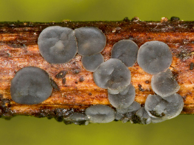 Opis: Saprob, raste razbacano ili u grupama, u proleće i leto na trulim stabljikama biljke Filipendula i grančicama kupine (Rubus spp.). Apotecije sedeće, prečnika 0,3-0,8 mm, nepravilno tanjiraste do diskolike. Himenijum plavo-siv sa oker ivicom. Spoljašnja površina braonkasta.