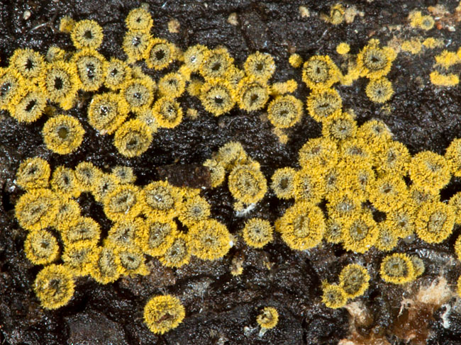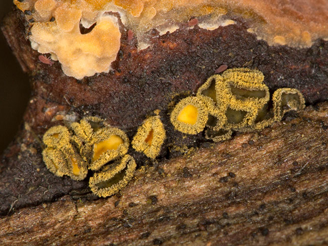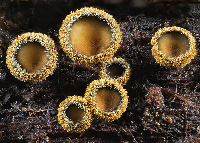 Opis: Raste u grupama, u proleće i jesen, na drvetu bez kore različitih vrsta listopadnog drveća. Apotecije sedeće, prečnika do 0,5-1 (-2) mm, okruglaste i zatvorene dok su mlade, a zatim peharaste sa savijenim ivicama; ponekad nepravilno deformisane. Himenijum zlatno-žut do braon-žut, gladak. Ivica i spoljašnja strana prekriveni gustim žuto-braon dlakama. Mikroskopske karakteristike: Dlake sivo braon sa maslinastom nijansom, (63-) 96-173 x (2,5-) 3-4,5 µm, ponekad izlaze i iz samog centra himenijuma, ± tankih zidova, grube i nepravilno bradavičave (oblik bradavica varijabilan), sa puno pregrada i sa tupim svetlijim vrhovima. Askusi sa 8 spora, nepravilno biserijatni, cilindrični, 45-55 x 5-6 µm, J+(c), kr.-. Parafize cilindrično-lanceolatne, blago sužene na krajevima, širine 1,8-2,2 µm, nadvisuju askuse za 6,5-8 (-14,5) µm, ispunjene refraktivnim vakuolama sa finom (žuto-) narandžastom nijansom u plazmi. Spore elipsoidno-glavičaste, glatke, hijaline, bez pregrada, 4-4,5 (-6,7) x 2-2,8 µm, prave ili blago zakrivljene, bez uljanih kapi. Rasprostranjenost: Evropa. Ref.: Sukova, M. (2005) A revision of selected material of lignicolous Lachnum species from the Czech Republic with a note on graminicolous material of the Lachnum pygmaeum complex.