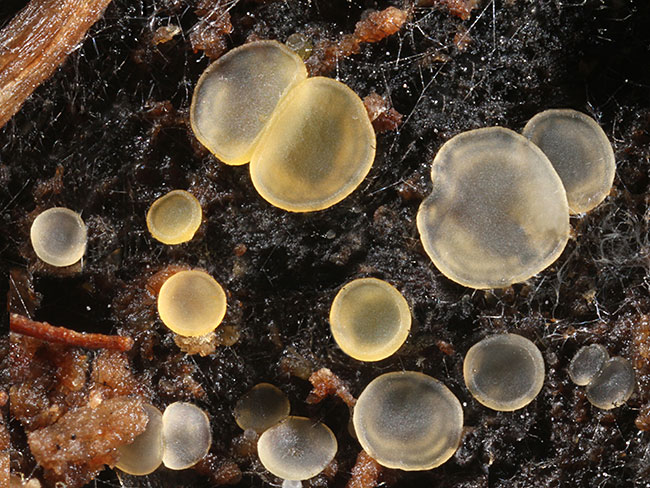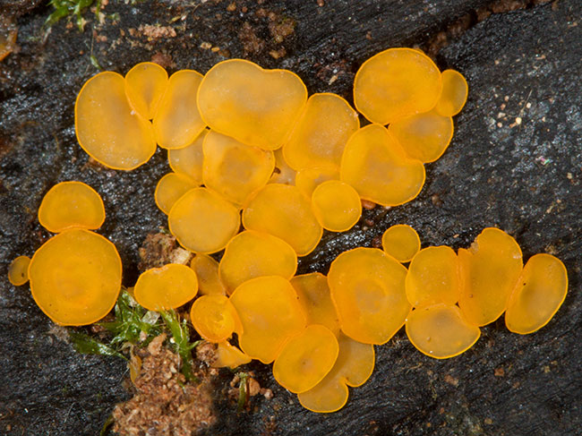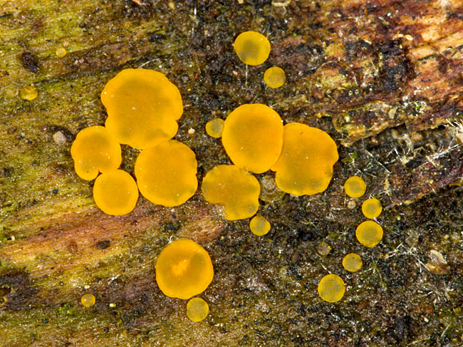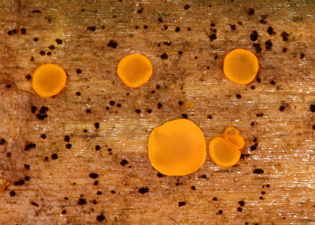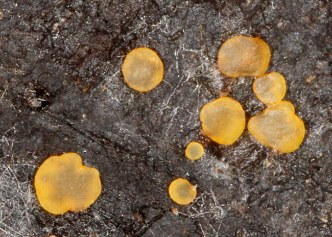Opis: Saprob, raste pojedinačno ili u grupama na kori i trulom drvetu raznih vrsta drveća. Apotecije subsedeće, svetlo narandžaste dok su sveže, prečnika 0.5-1,5 mm, diskoidne ili blago peharaste, središnjim delom pričvršćene za podlogu. Himenijum gladak, ravan ili konkavan kad je vlažan, ivica ravna ili blago urolana kad se osuši.