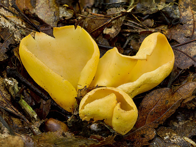 Opis: Saprob, raste pojedinačno ili u grupi od kasnog leta do jeseni na zemlji po listopadnim i četinarskim šumama. Apotecije prečnika 2-6 cm i visine 3-10 cm, sa jedne strane veće, nepravilno uholike, vezane za podlogu kratkom, nejasnom, beličastom drškom. Himenijum žućkast do narandžast, sa roze odsjajem, spoljašnja površina slične boje ali bez roze odsjaja i blago perutava. Meso tanko, krto, belo.
