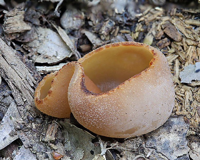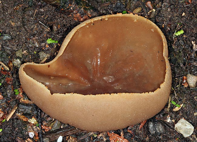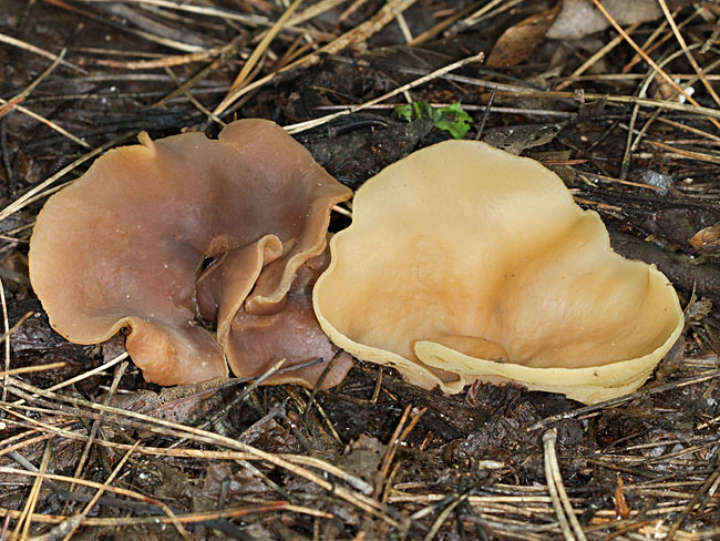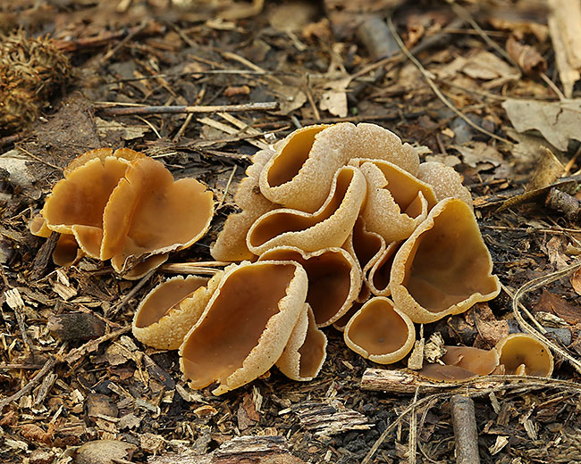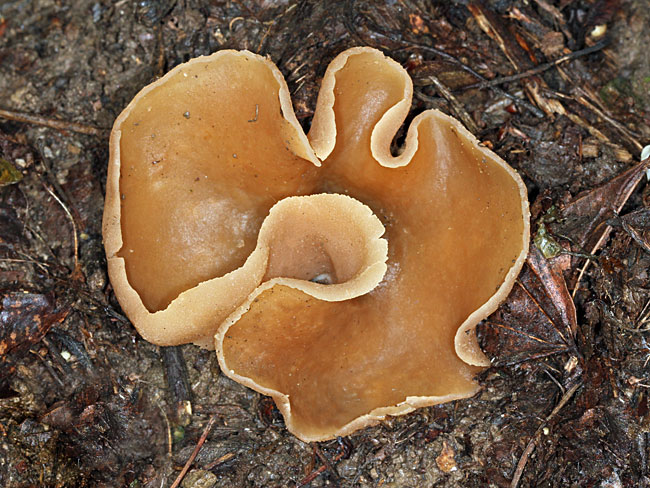 Opis: Saprob, raste od proleća do jeseni pojedinačno ili u grupi na zemlji ili jako trulom drvetu po listopadnim šumama. Apotecije prečnika 3-12 cm, u početku peharaste a zatim se šire, sa talasastim i iskidanim ivicama; zrele nepravilno spljoštene, ili savijene unazad. Za podlogu vezane centralno, bez drške ili u donjem delu sužene nalik maloj dršci. Himenijum gladak, bledo oker-braon do kestenjast; spoljašnja strana beličasta, slabo dlakava i pomalo perutava. Meso braonkasto ili bledo, krto, bez mirisa.