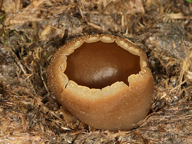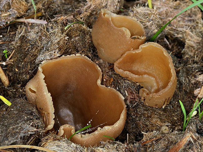 Opis: Saprob, raste tokom cele godine pojedinačno ili češće u grupi na konjskoj balegi ali i na nađubrenoj zemlji. Apotecije prečnika 3-8 (10) cm, dok su mlade zatvorene a kasnije peharaste, sedeće, sa često jako savijenom ivicom ka unutra. Himenijum gladak, svetlo oker-braon, kao poliran, često naboran; spoljašnja strana glatka, oker do prljavo beličasta, dlakava, perutava. Meso bledo, krto.
