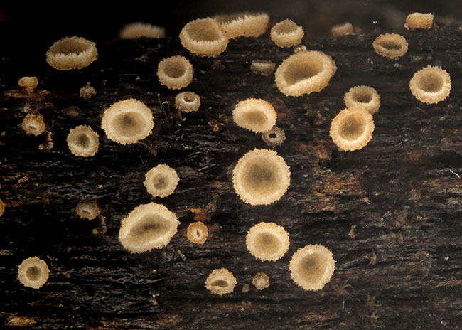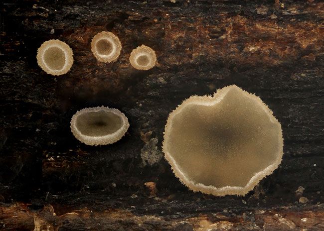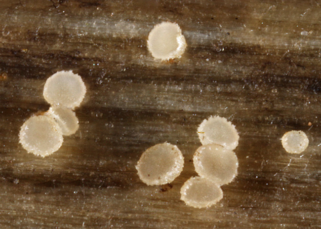 Opis: Raste u grupi, na ostacima zeljastih biljaka. Apotecije izranjaju iz podloge, subsedeće, prečnika do 0,8 mm. Himenijum krem kad je svež, braonkast kad se osuši. Receptakulum plitko peharast, iste boje kao himenijum, prekriven kratkim belim dlakama koje ivici daju izgled kao da je savijena na dole. Mikroskopske karakteristike: Spoljašnji ekscipulum od textura angularis, sastavljen od hijalinih do svetlo braonkastih ćelija sa tankim zidovima. Dlake cilindrične, zaobljene na vrhu, sa 0-1 pregradom, hijaline, sa glatkim tankim zidovima, 20-25 × 3-4 µm. Askusi sa (4-) 8 spora, cilindrično-glavičasti, 25-35 × 4-5 µm, J+(p), kr.+. Parafize lanceolatne, širine do 2-3 µm, nadvisuju askuse do 10 µm, prilično debelih zidova, sa pegradama i zašiljenim vrhom, sa izduženim cilindričnim vakuolama. Spore usko glavičaste do usko vretenaste, bez pregrada, sa više sitnih uljanih kapi, 7-11 (-12) × 1,7-2,2 µm. Rasprostranjenost: Evropa i Severna Amerika. Ref.: Raitviir, A. (2004) Revised synopsis of Hyaloscyphaceae.