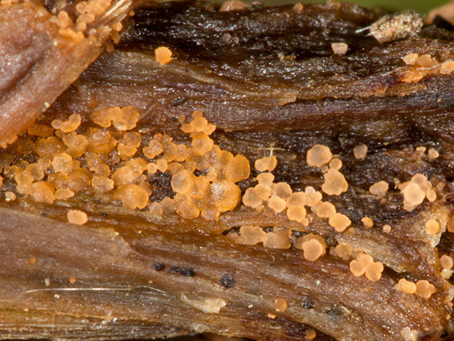 Apotecije prečnika 0,1-0,8 mm, u početku pljosnate a zatim